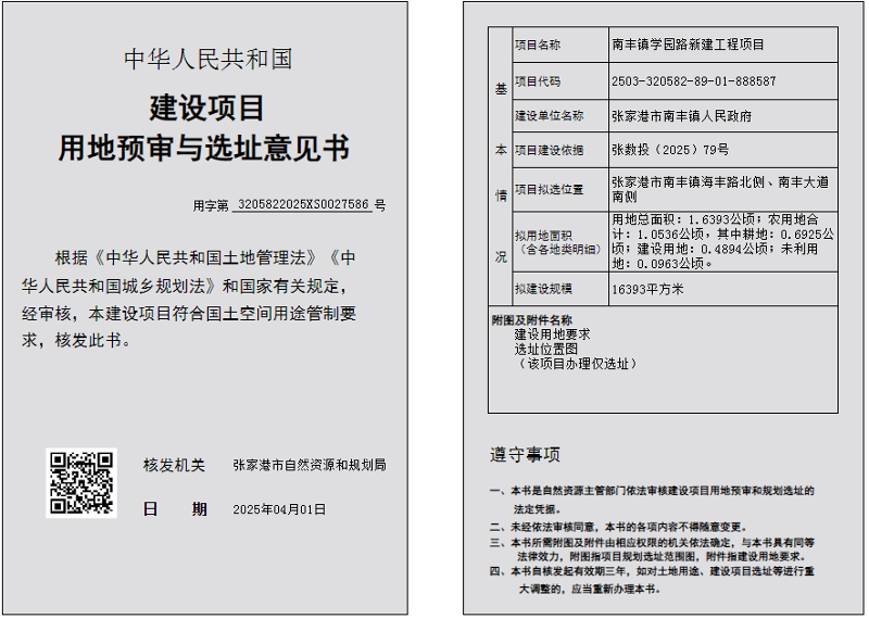 建设项目用地预审与选址意见书:张家港市南丰镇人民政府南丰镇学园路新建工程项目